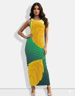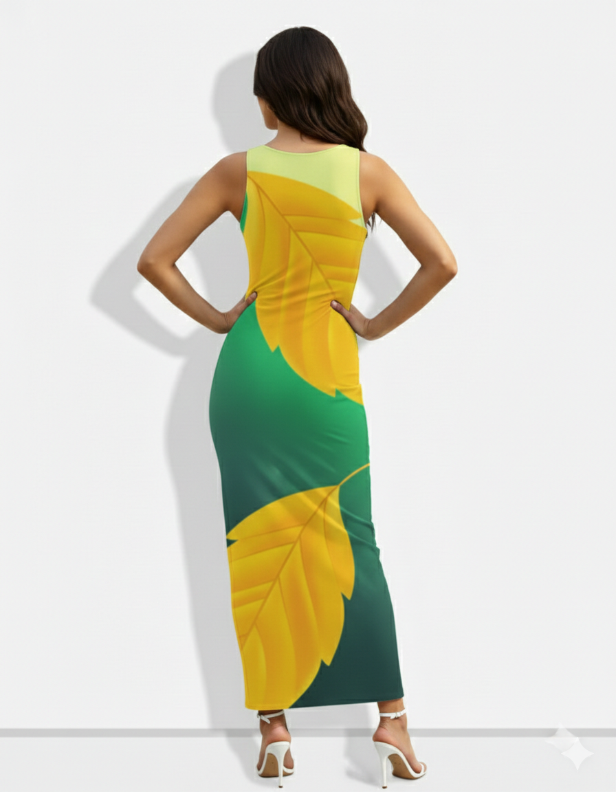 A fitted sleeveless maxi dress in rich green, highlighted with oversized golden leaf motifs for a bold, nature-inspired statement.