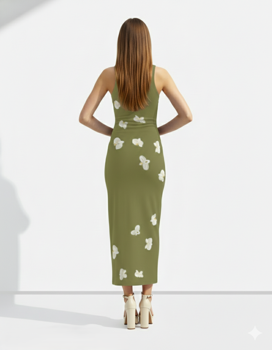 A sleeveless olive-green bodycon maxi dress adorned with delicate scattered white floral accents for a soft, natural, and elegant look.