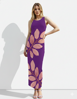 A sleeveless purple bodycon maxi dress featuring a soft blush leaf motif for an elegant, artistic, and nature-inspired look.