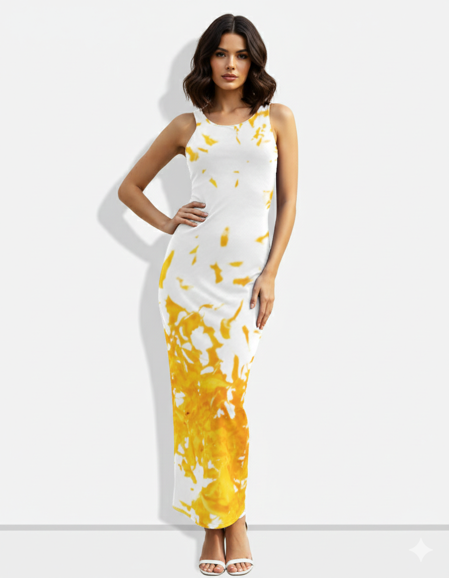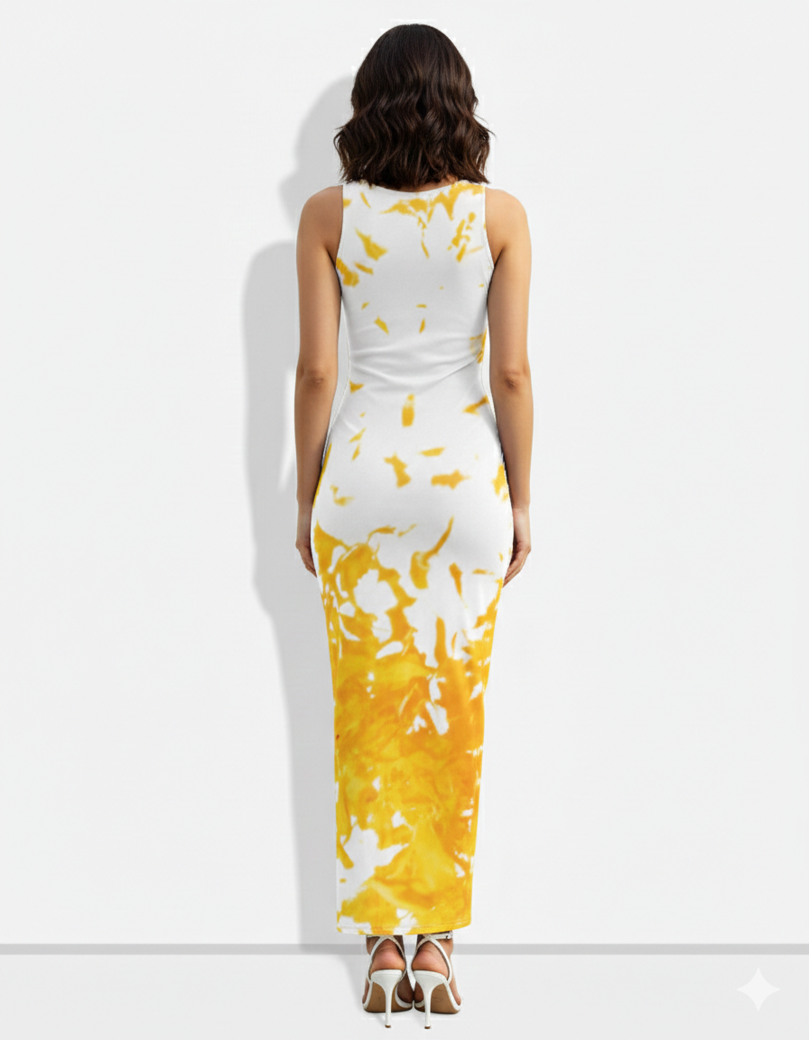 A sleek white sleeveless bodycon midi dress accented with a bold yellow abstract splash print for a modern, artistic look.