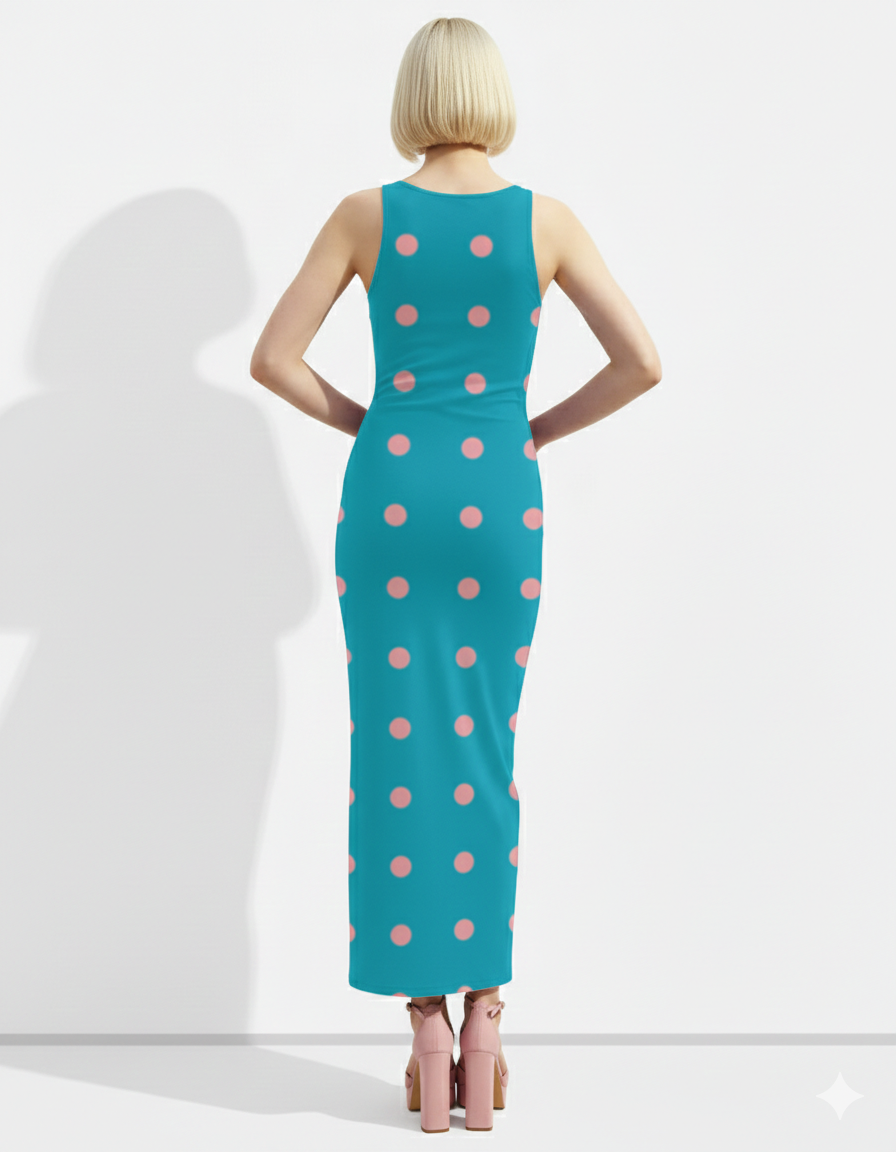 A sleeveless teal bodycon maxi dress decorated with soft pink polka dots for a fun, playful, and retro-inspired look.
