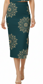 A repeating pattern of intricate gold mandala designs set against a deep teal background Pencil Skirt
